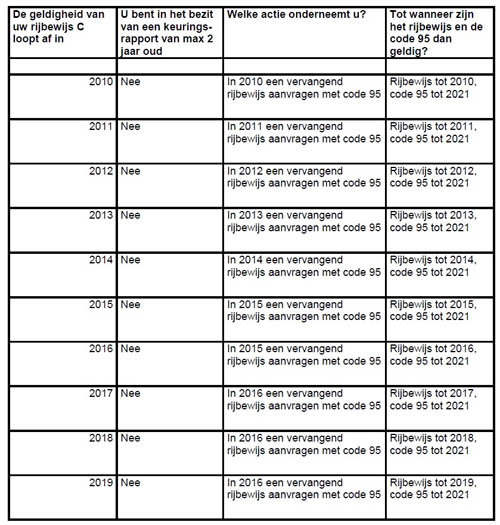 Vanaf 10 september 2015 (D) en 10 september 2016 (C) moet iedere beroepschauffeur een code 95 op het rijbewijs hebben.